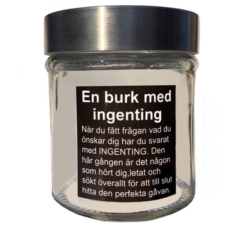 Kort och gott en glasburk med plåtlock med ingenting. Burken har texten "En burk med ingenting När du fått frågan vad du önskar dig har du svarat med INGENTING. Den här gången är det någon som hört dig, letat och sökt överallt för att till slut hitta denna perfekta gåvan." Mått:8,5x10cm.