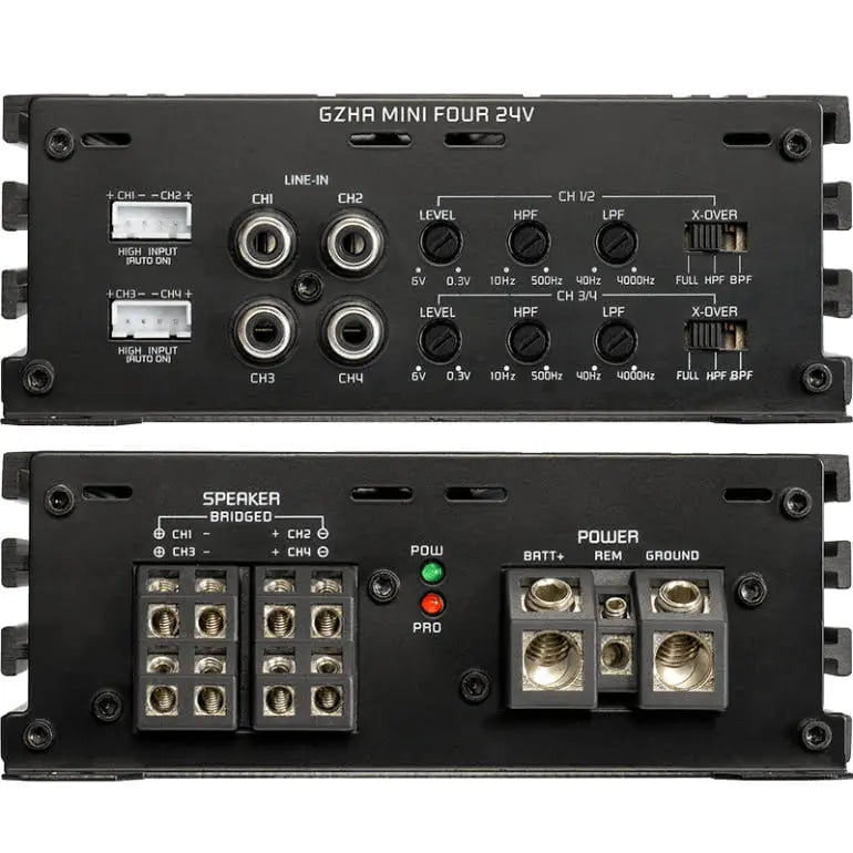 Ground Zero GZHA MINI FOUR 24V är ett mycket kompakt men kraftfullt Class-D slutsteg i Hydrogen-serien som lämnar 4x130Wrms i 2Ω, 4x80Wrms i 4Ω.