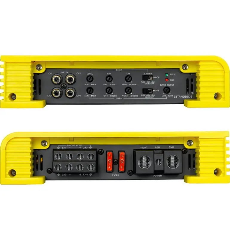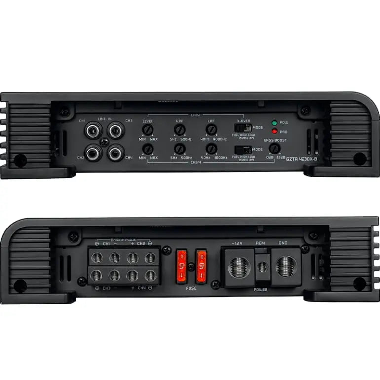 GZTA 4230X-B går även att bryggkopplas för att driva basar eller för dig som behöver mycket effekt på framdörrarna! I bryggkopplat läge levereras 2x550Wrms!