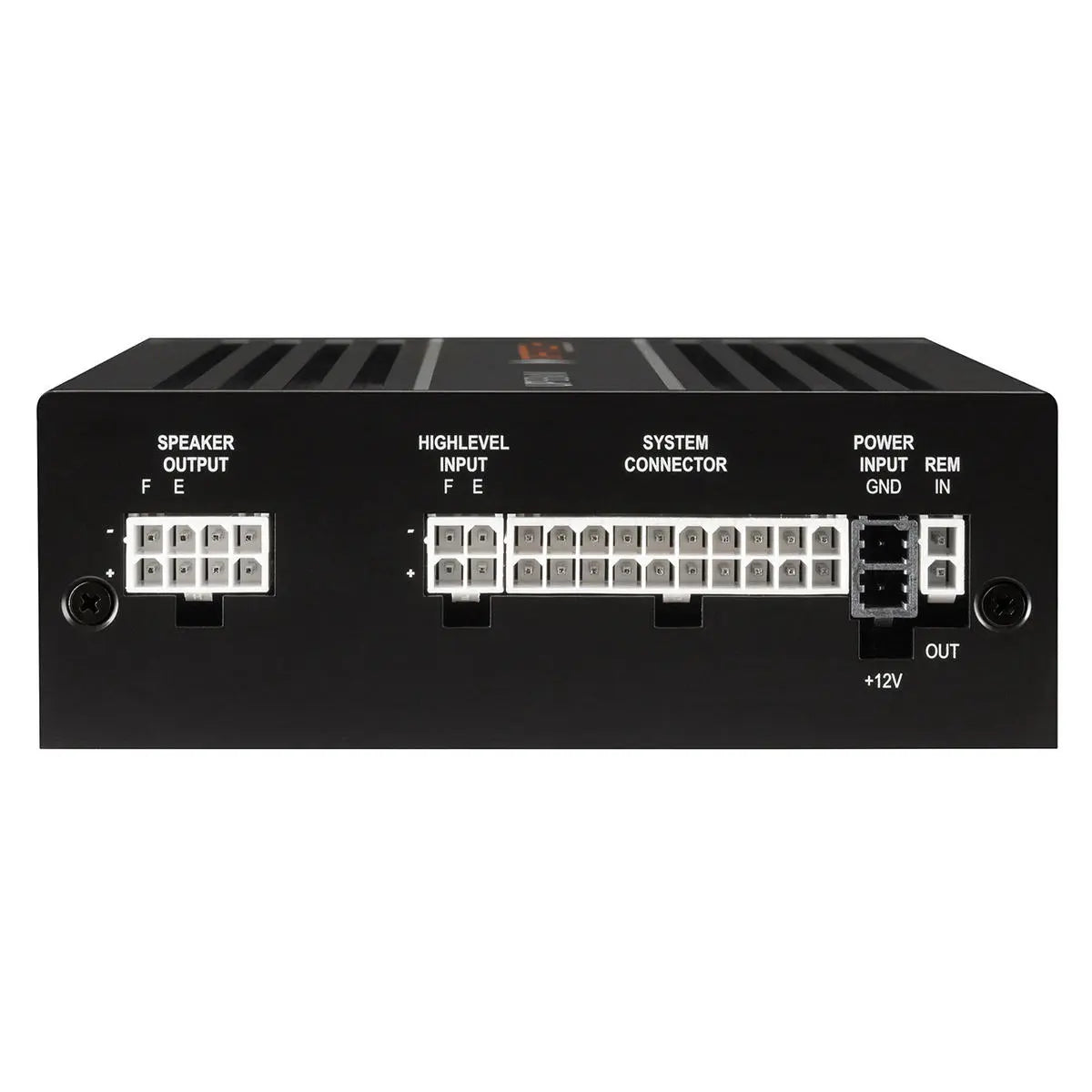 - Effekt: 4 × 65 W RMS @ 4 ohm + 2 × 90 W RMS @ 4 ohm eller 2 × 160 W RMS @ 2 ohm (kanal 5–6)