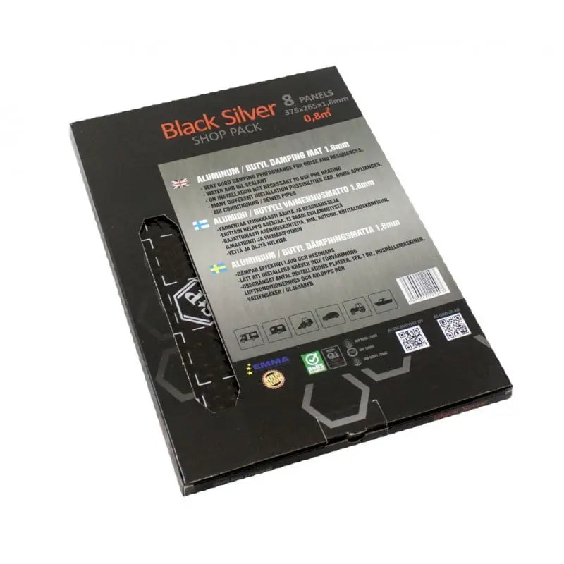 STP Black Silver Shop är en förpackning med 8st ark 1.8mm tjock dämpmatta av butylmassa med ett tunt aluminium lager utanpå.